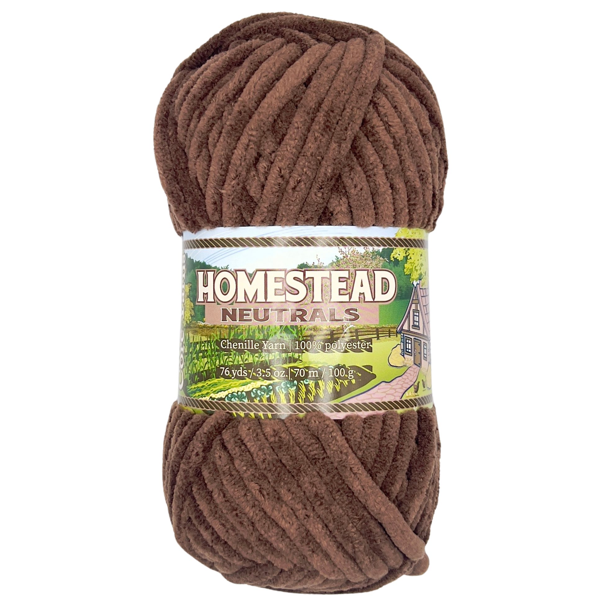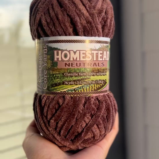 Firewood is a cool-toned dark brown yarn. Each skein is made from ultra-soft chenille yarn designed to shed less than standard options-- perfect for both beginners and seasoned crafters. Our yarn uses a specially designed manufacturing process to keep the fuzz on the yarn, rather than on you. This plushie yarn is perfect for crochet amigurumi, baby gifts, and more. The Homestead Neutrals is a staple set of five neutral tones designed for everyday making.