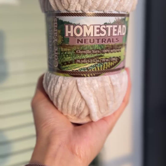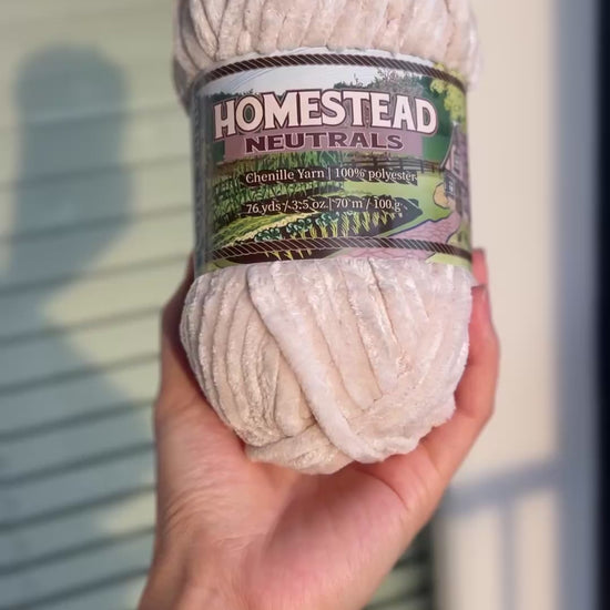 Morning Fog is a cool-toned white yarn. Each skein is made from ultra-soft chenille yarn designed to shed less than standard options-- perfect for both beginners and seasoned crafters. Our yarn uses a specially designed manufacturing process to keep the fuzz on the yarn, rather than on you. This plushie yarn is perfect for crochet amigurumi, baby gifts, and more. The Homestead Neutrals is a staple set of five neutral tones designed for everyday making.
