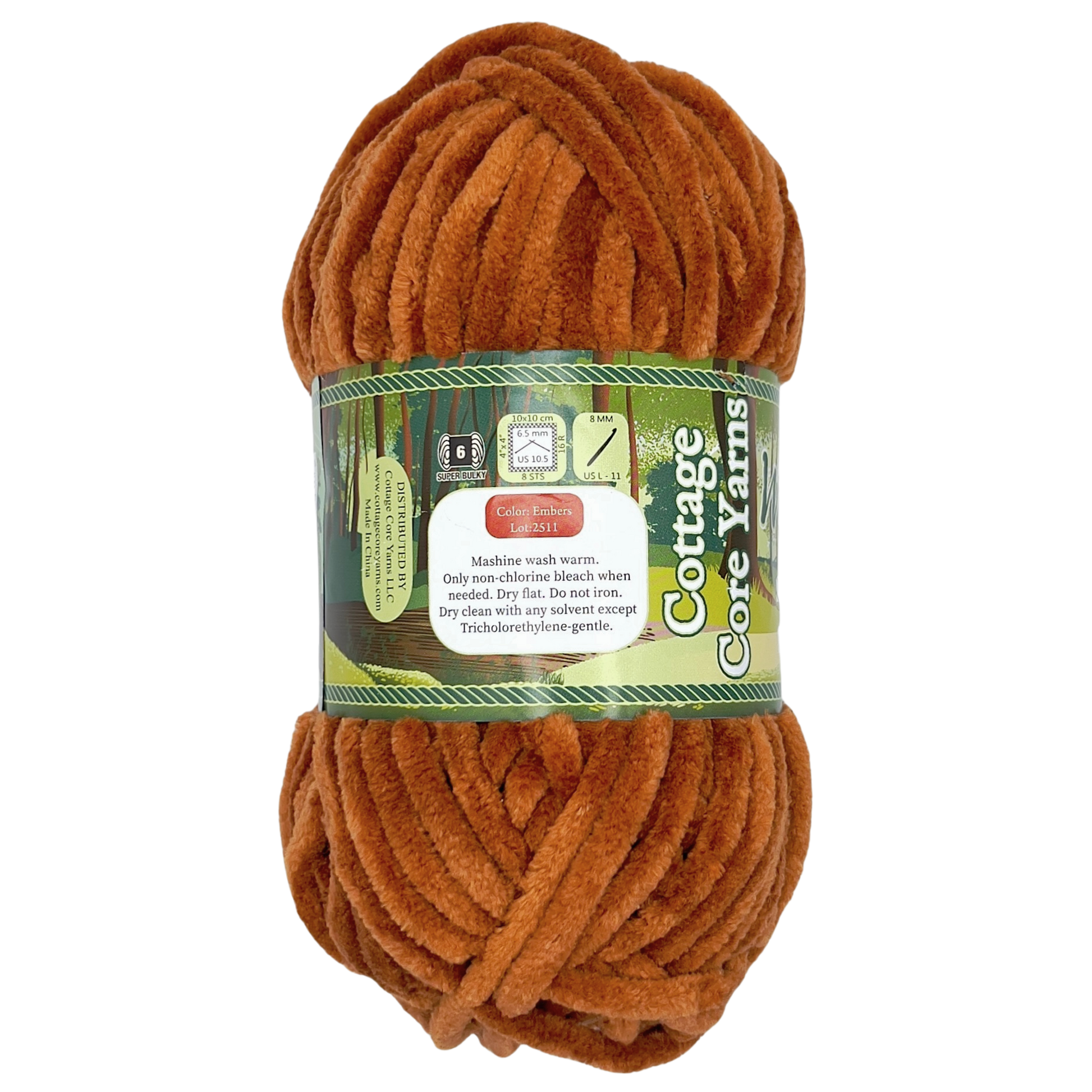 Embers is a burnt orange yarn. Each skein is made from ultra-soft chenille yarn designed to shed less than standard options-- perfect for both beginners and seasoned crafters. Our yarn uses a specially designed manufacturing process to keep the fuzz on the yarn, rather than on you. This plushie yarn is perfect for crochet amigurumi, baby gifts, and more. The Woodlands collection is a rich, earthy range of six deep tones inspired by forests, firewood, and river trails.