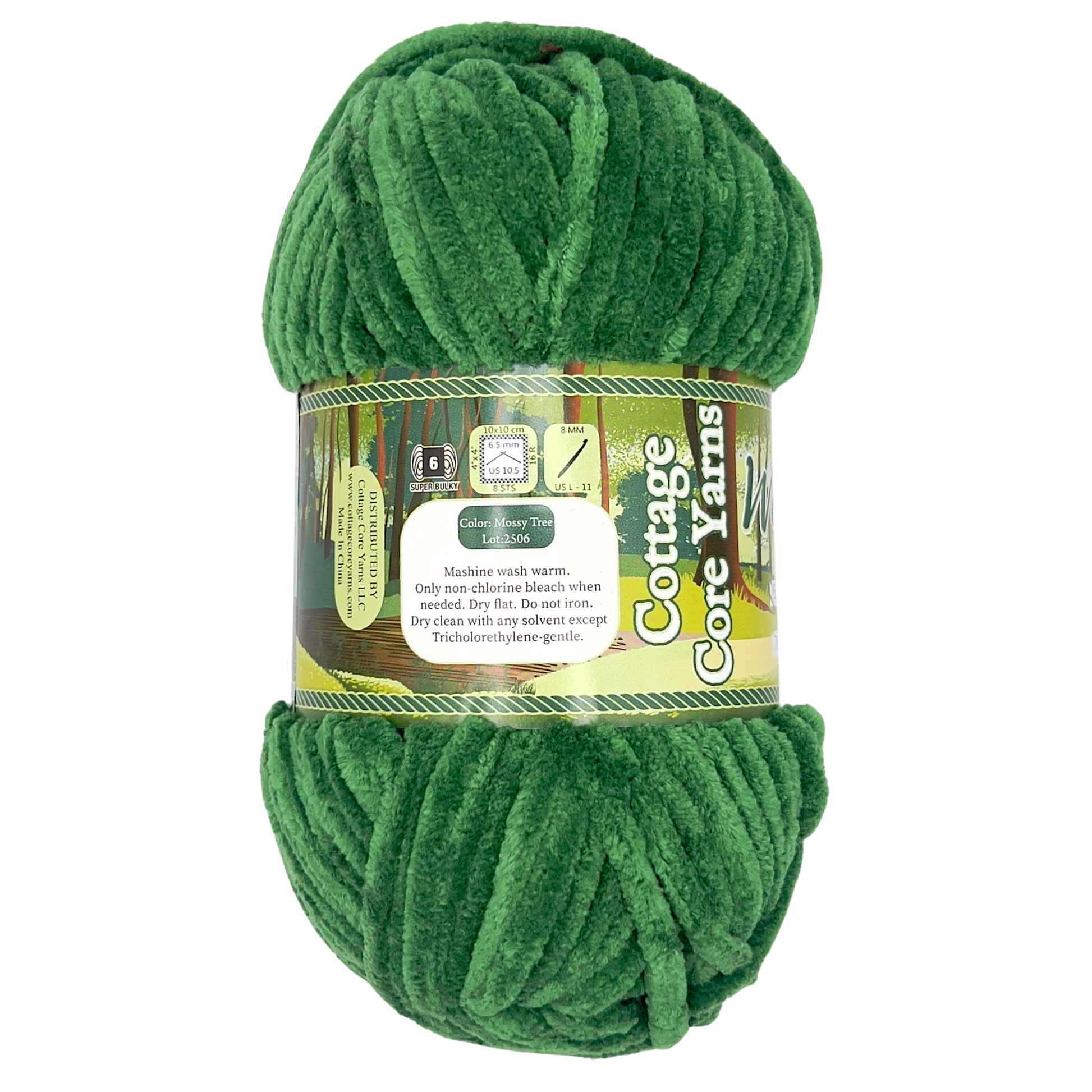 Mossy Tree is a deep, forest green yarn. Each skein is made from ultra-soft chenille yarn designed to shed less than standard options-- perfect for both beginners and seasoned crafters. Our yarn uses a specially designed manufacturing process to keep the fuzz on the yarn, rather than on you. This plushie yarn is perfect for crochet amigurumi, baby gifts, and more. The Woodlands collection is a rich, earthy range of six deep tones inspired by forests, firewood, and river trails.